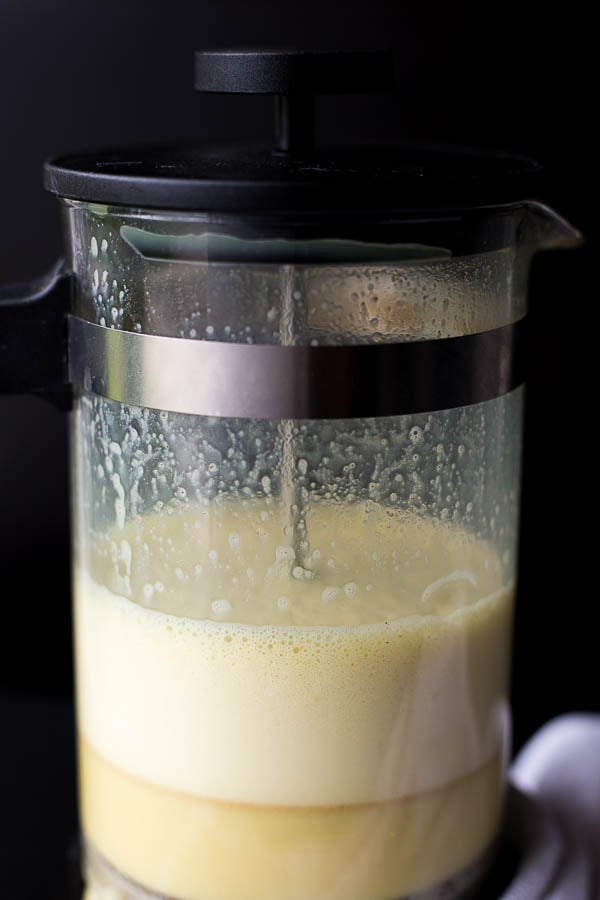 - Pour into a french press. Insert the press and quickly push it down, then pull it up continuously for 15-25 seconds, or until the latte is frothed to your liking. I like a lot of froth, so I do this for the full 25 seconds.