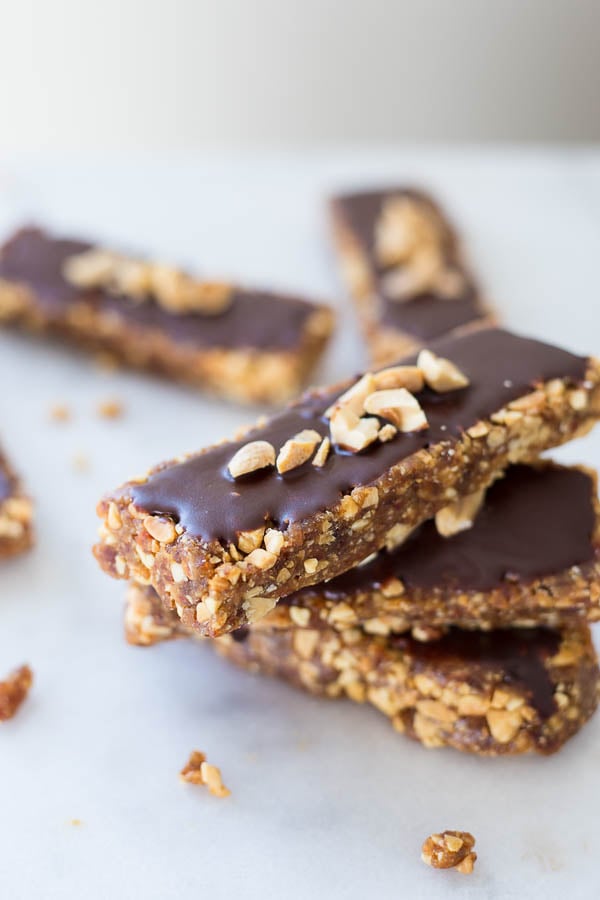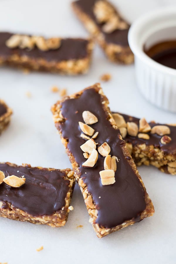 I’m serious when I tell you that they taste like a candy bar. So much so, that I almost called these Healthy No-Bake Snickers Bars. But Mark and I both agreed that “Peanut Butter Cup Snack Bars” really captured the complete and total epicness that is these bars.