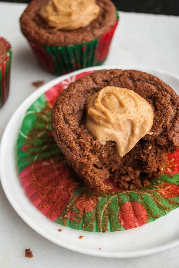 Because of all of this (sorry) moistness going on, the muffins will probably sink in the middle ever-so-slightly. No matter! Just fill the little crevice with a creamy peanut butter-almond milk-maple syrup mixture, and it’ll act as the BEST healthy “frosting!” It’s our birthday, dangit! Let’s celebrate with healthy peanut butter frosting mmmkay?!
