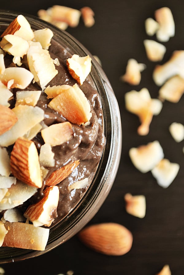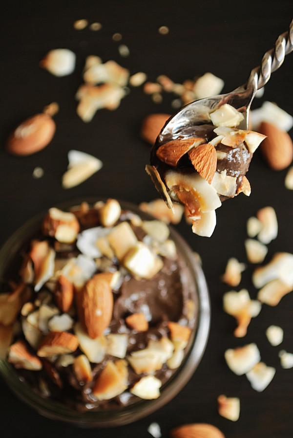 - Scoop chocolate avocado pudding into a small bowl or container and mix in coconut and almonds. Cover and place in the fridge to chill overnight.