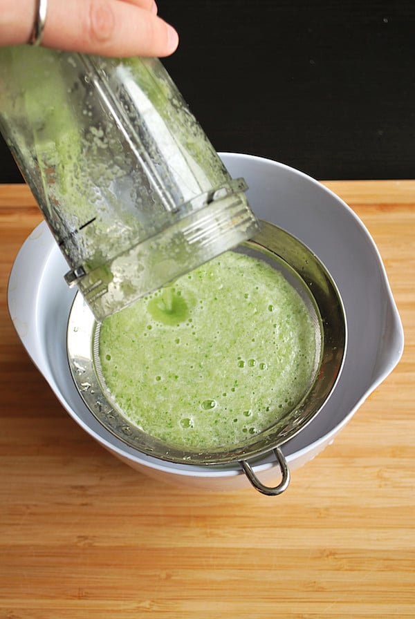 Step 4: Slowly empty your juice’s contents into the fine mesh strainer. The fibrous pulp will stay in the sieve, while the super duper smooth juice will drain into the bowl.