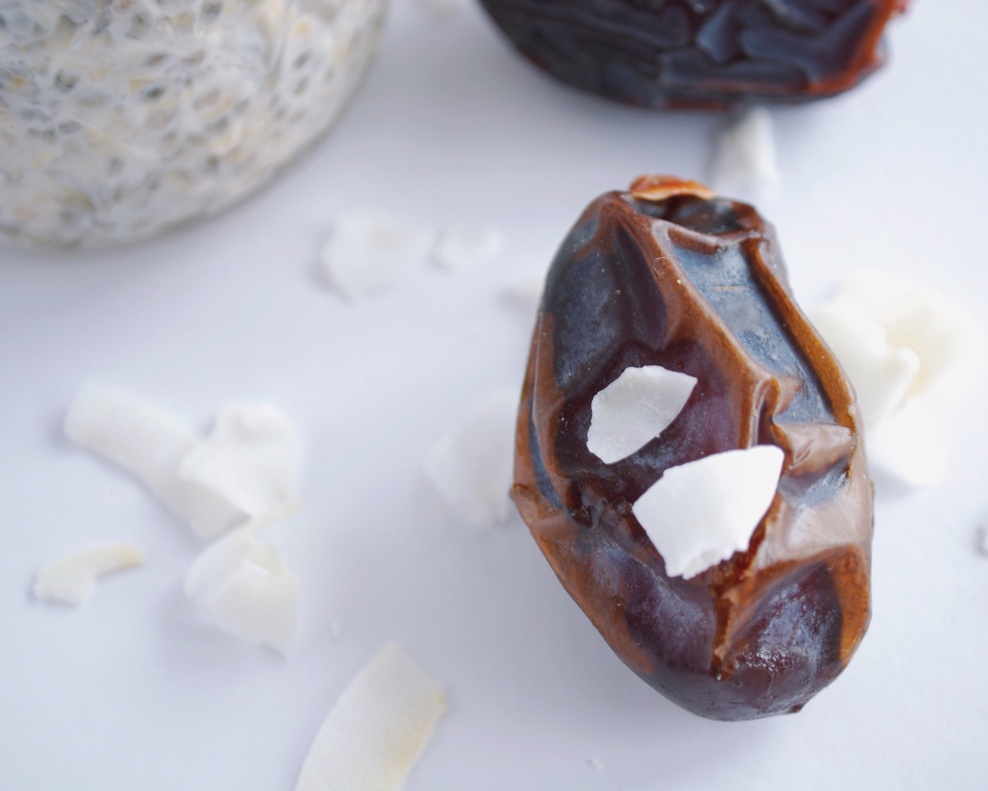 - Make the coconut caramel**: In the morning, place dates and almond butter in a small food processor or blender. Blend until smooth. Add just enough liquid to allow mixture to blend. Add coconut and pulse until slightly chunky. Set aside.