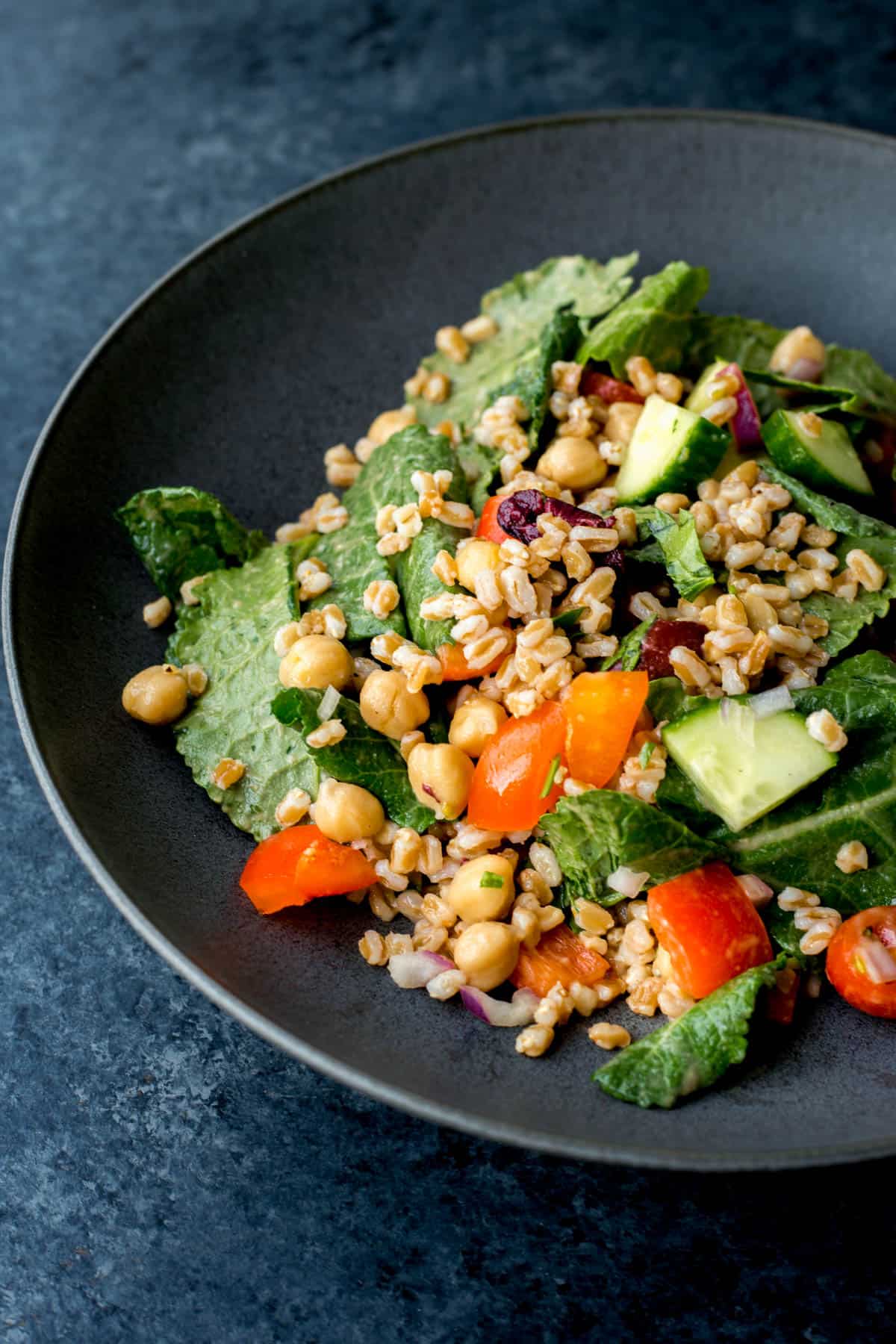 As for dressing? I like this Creamy Balsamic Vinaigrette. Nay. I love this Creamy Balsamic Vinaigrette. And I sometimes make it extra thick by adding a bit more hummus so that it clings to the farro in just a very seductive and luxurious way.