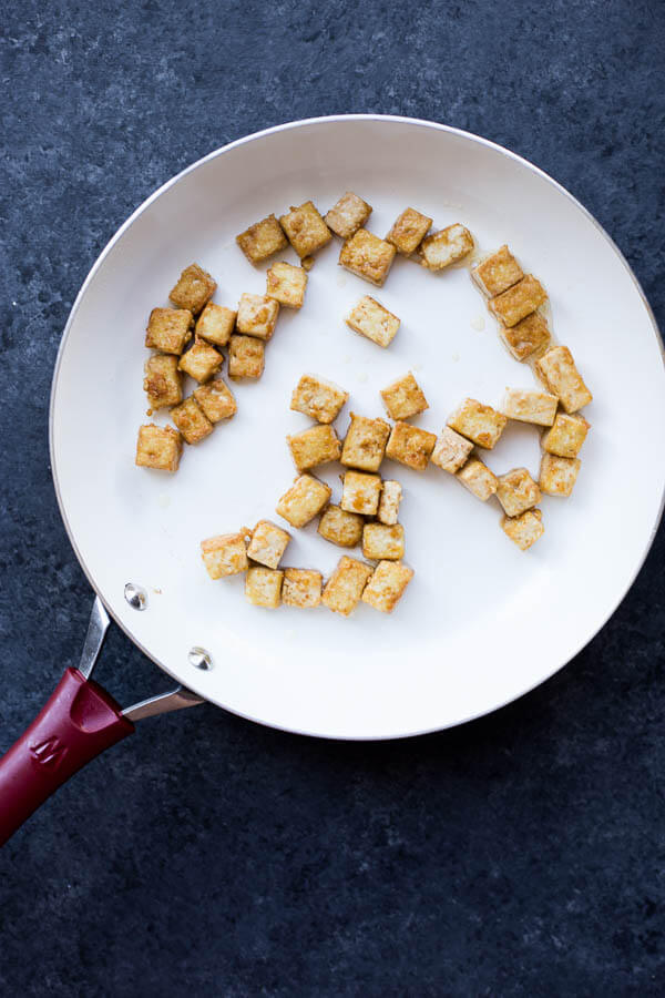 - Once your tofu is crispy, carefully remove it from the skillet and place it on a cooling rack to cool. Enjoy warm or at room temp!