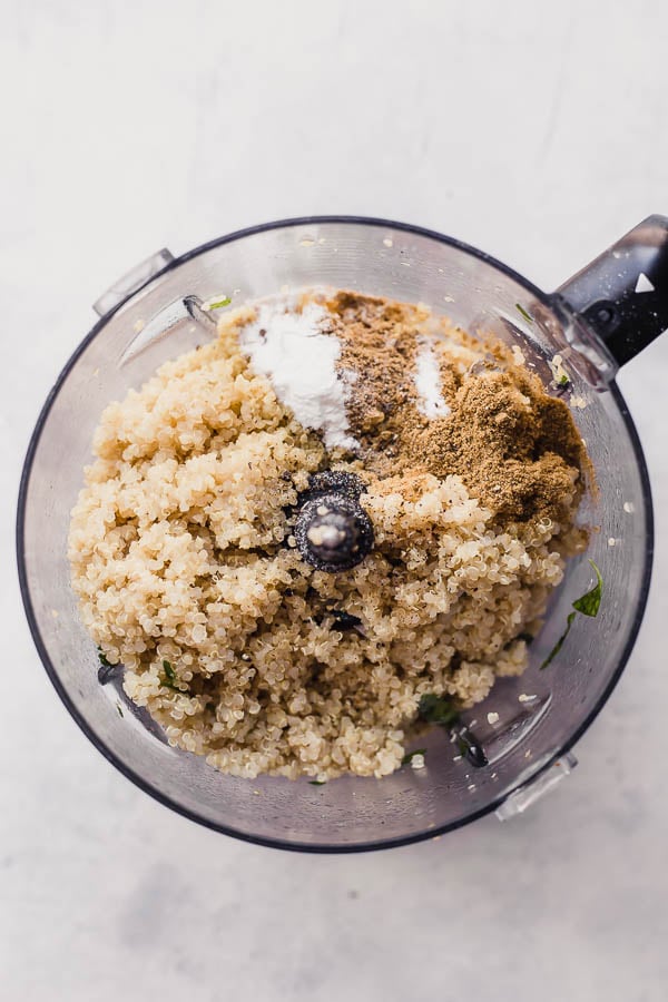 - Blend blend blend. First, you’ll add your lemon zest, lemon juice, sautéed onion and garlic, and parsley in the food processor and process that first. This gets rid of that big chunks of everything problem. Then you’ll add your warm quinoa and process until it almost looks like a dough. It started to ball up like dough does right before I stopped my food processor and it worked perfectly!