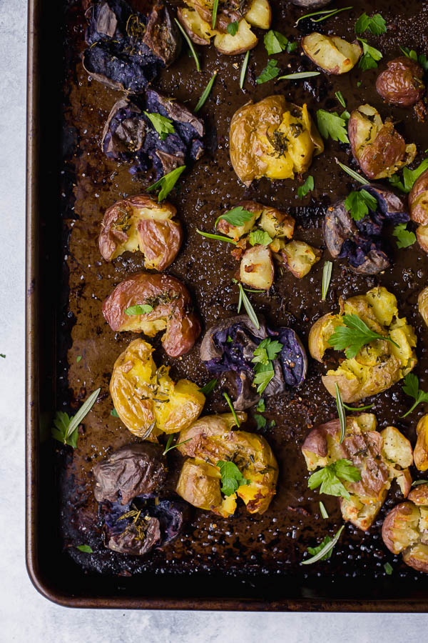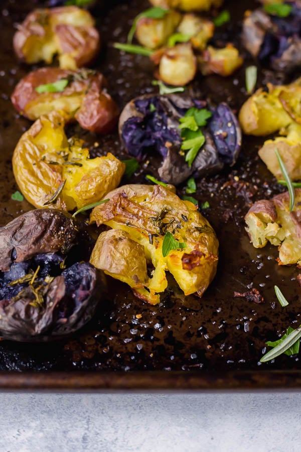 Tender, crispy, herby, and garlicky! These potatoes are absolutely heavenly as a Thanksgiving or holiday side!