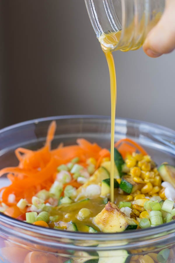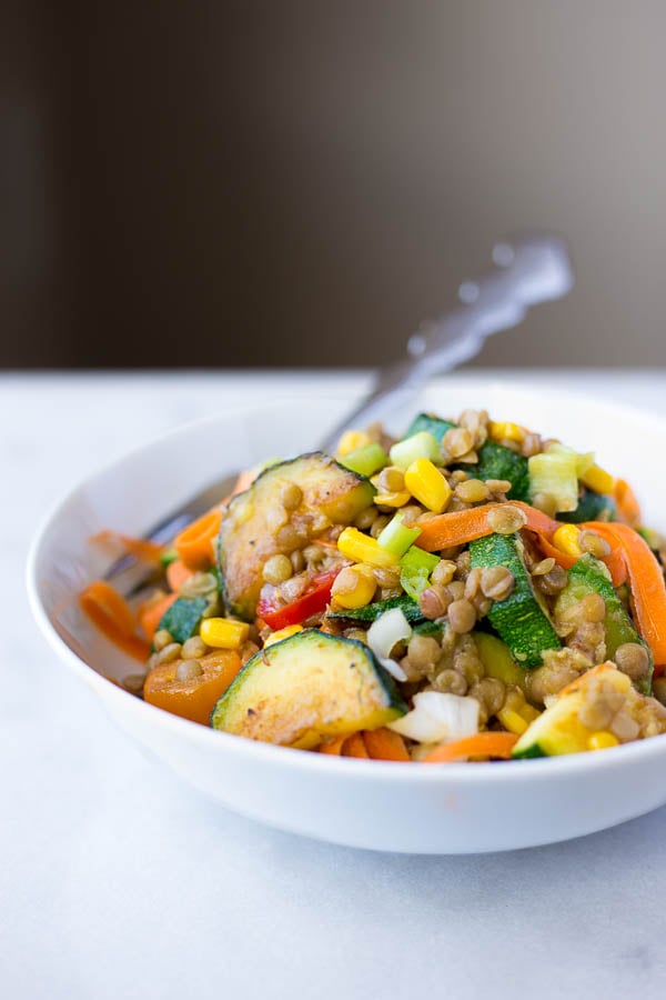 - Add cooked lentils to a large bowl. Add sautéed zucchini and corn, carrot ribbons, and tomatoes. Pour half of the dressing over top, seasoning with salt and pepper if needed. Sprinkle with green onions and serve with extra dressing on the side.