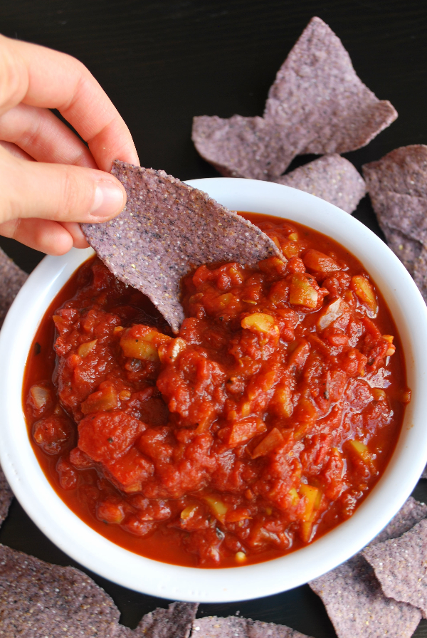 I actually adapted this recipe from Mark’s dad, who makes some of the best salsa on the planet by using ingredients from his very own garden. He was kind enough to share his sacred salsa recipe (+ some of his favorite ingredients) with me. And while I put my own little spin on the recipe, the essence of “Tom’s Salsa” still remains.