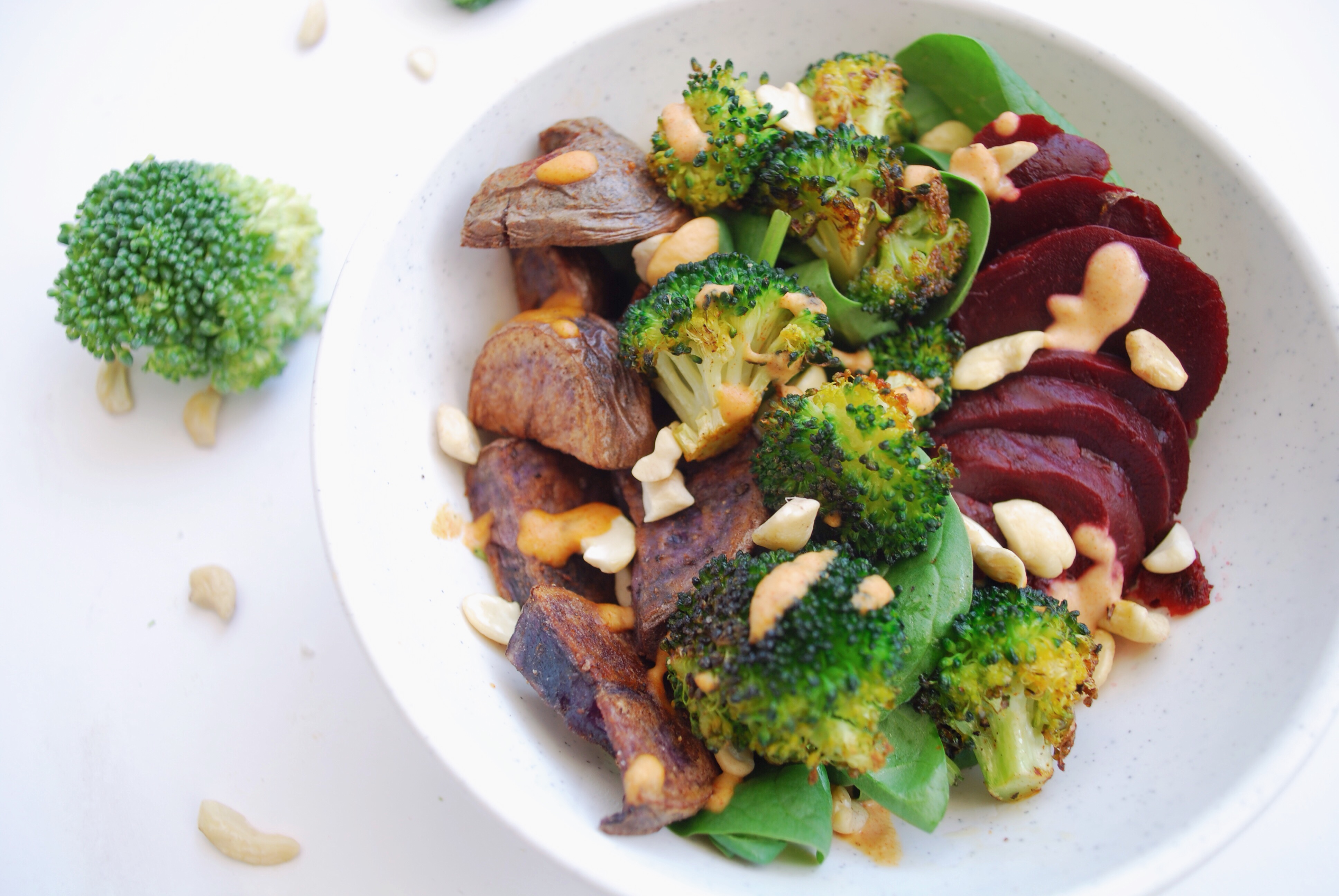 - Assemble the bowl: Add spinach to a bowl, followed by beet slices, broccoli, and potato pieces. Sprinkle toasted cashews on top, and add salt and pepper if needed. Top with a drizzle of the dressing**.