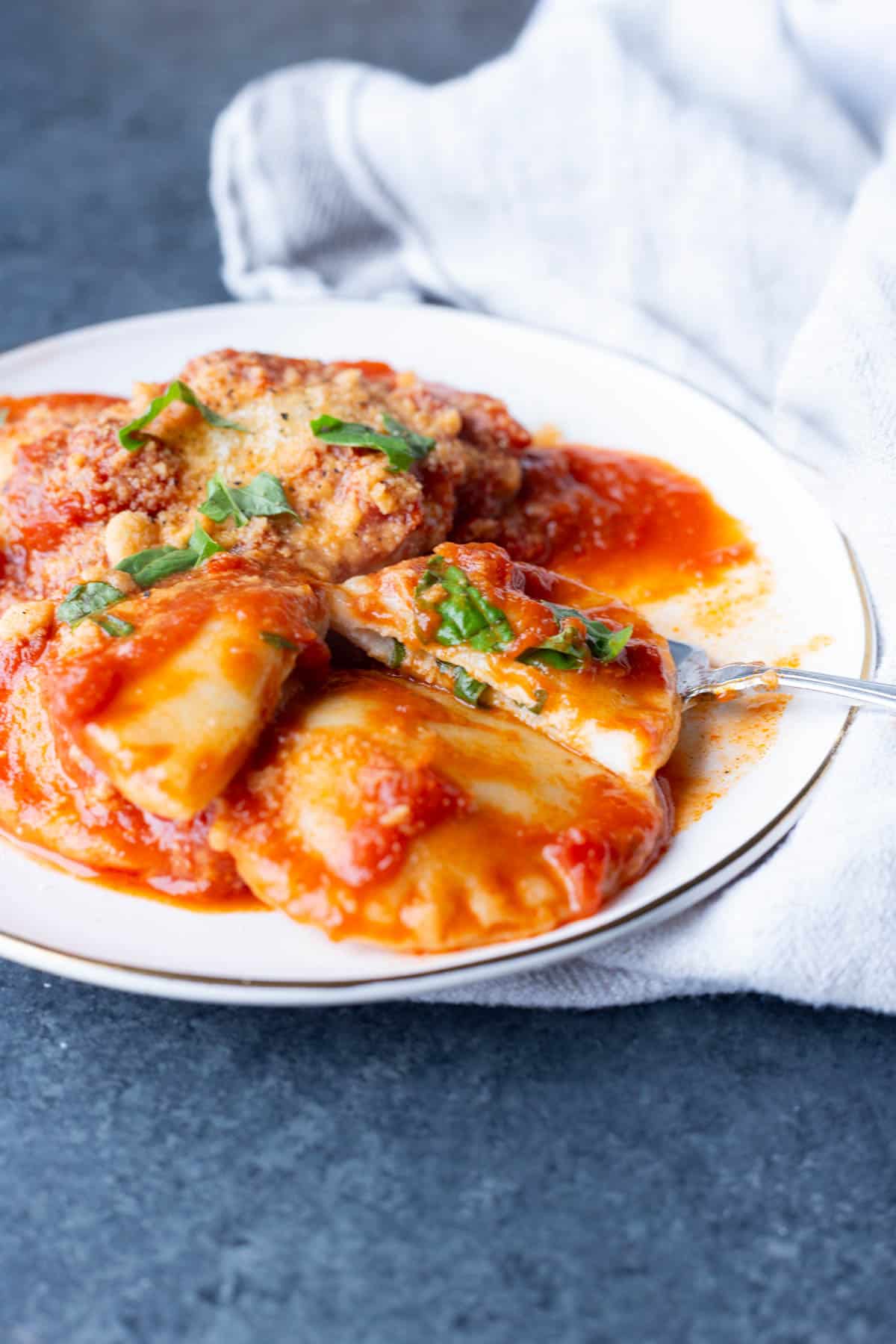 I like to cook my homemade pasta from frozen, and I tossed these ravioli in a spicy tomato sauce. But use your fave, or try: