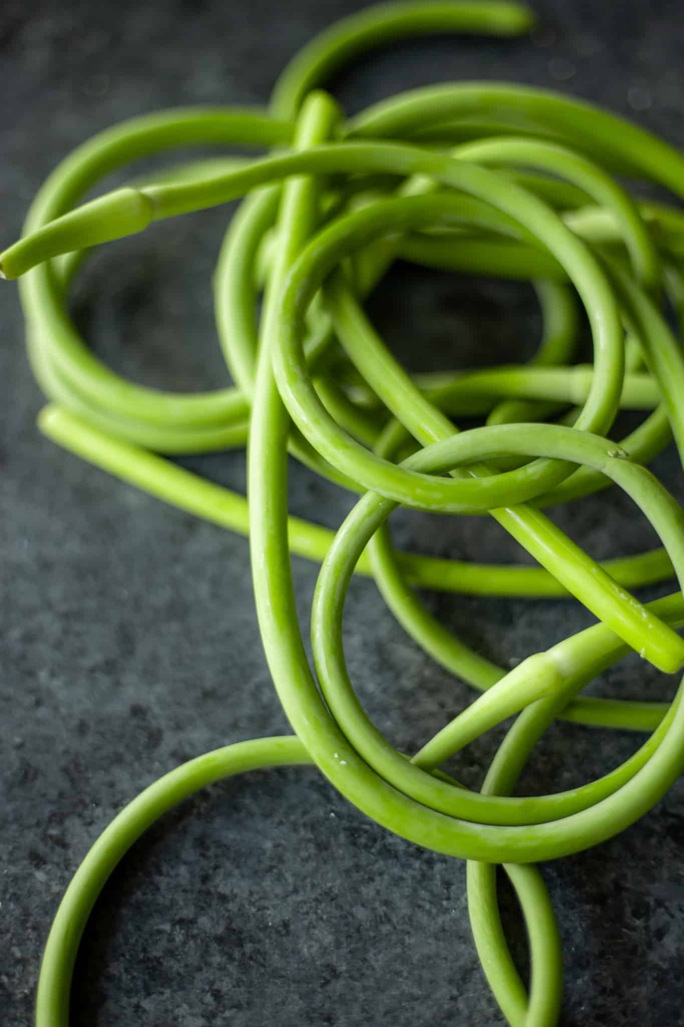 If you’re unfamiliar with garlic scapes, don’t feel bad. This was the first time I’ve ever bought them tbh! They are the green sprouty parts of a bulb of garlic. They’re typically in-season in late spring and early summer, so I was surprised and delighted to find them at the end of