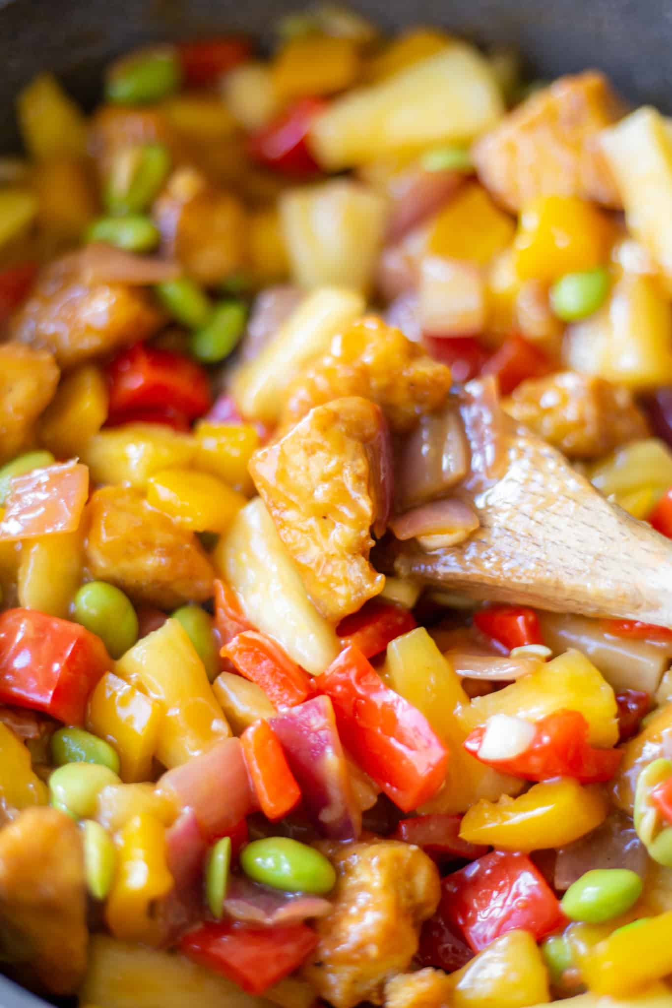 And then the sauce! You’ll need ingredients like pineapple juice, rice wine vinegar, soy sauce, sesame oil, garlic, and ginger to make this tangy, sweet-sour sauce! There’s also a bit of cornstarch in the mix so it thickens as it cooks, which helps coat all of your veg and tofu beautifully.