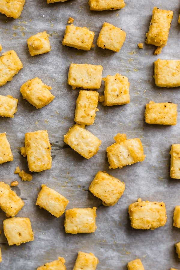 - Add your tofu to the prepared baking sheet, laying the tofu in an even, single layer, making sure that none of the pieces are touching.