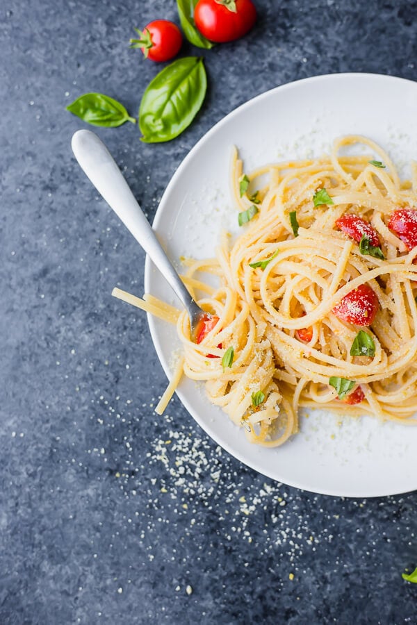 First: omg. This is my ideal pasta situation. Tons of garlic, fresh tomatoes (from the Fooduzzi garden!!), lots of torn basil, rich extra virgin olive oil…and that’s about it.