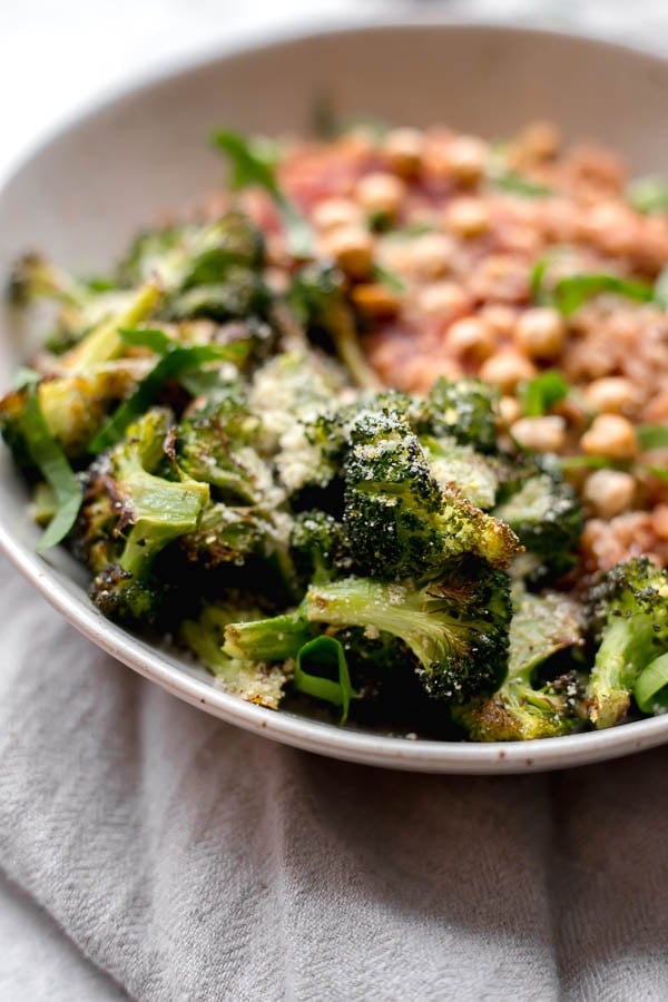 Vegan Marinara Farro with Roasted Broccoli and Chickpeas