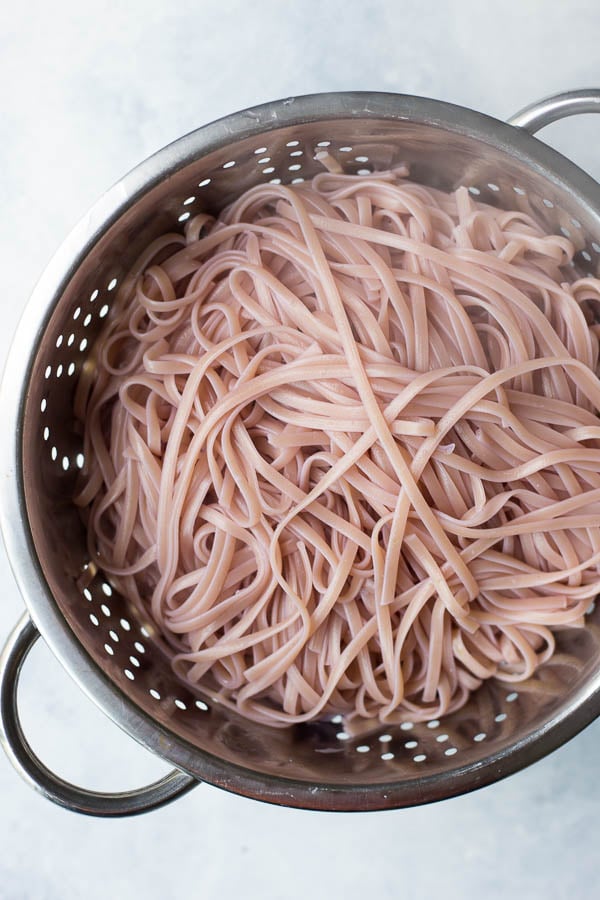 You’ll boil some purple cabbage in water for about 20 minutes. The water goes from being clear to that beautiful purple color at the top of that glass ^^. This is the water you’ll use to boil your pasta!