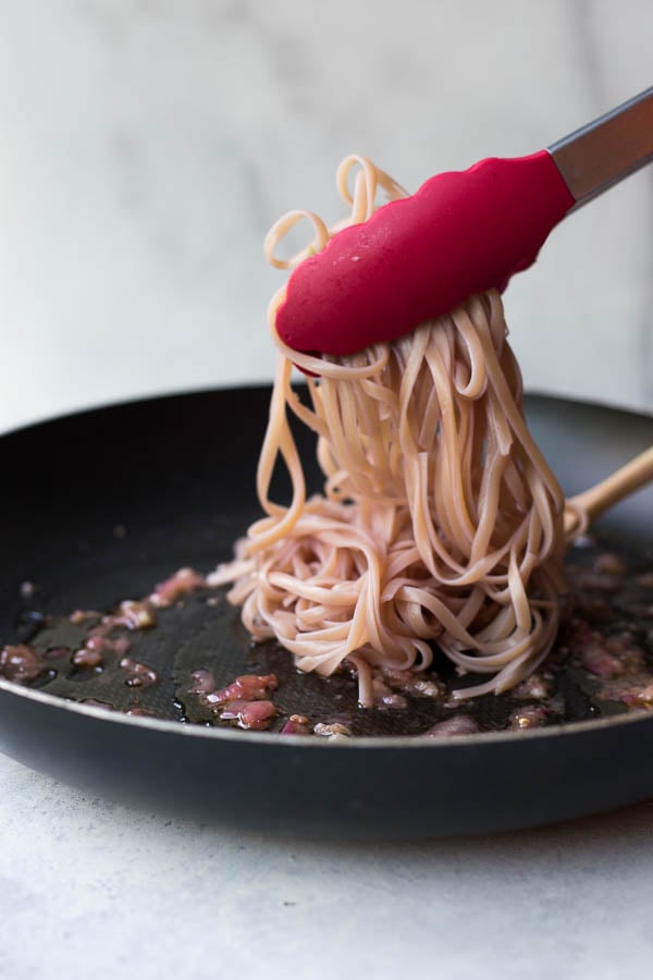 - Once your pasta is al dente, use tongs or a kitchen spider to add it to the sauce. Some pasta water will end up in the skillet - that's okay because it'll thicken the sauce. Toss your pasta in the sauce and watch it turn bright pink! Top with your desired toppings (parsley, vegan parm, lemon zest, red pepper flakes, etc.), and enjoy!