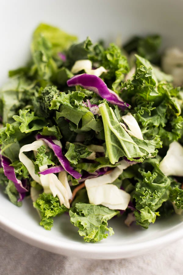 PLUS! My new favorite kale slaw. It’s super simple, but the flavor is like woah. We’re taking some kale and shredded cabbage, and then dressing it in a creamy dreamy sauce.