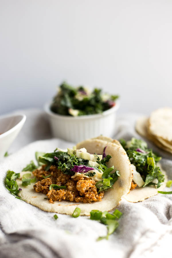 Vegan Tofu Quinoa Tacos with Tahini Kale Slaw