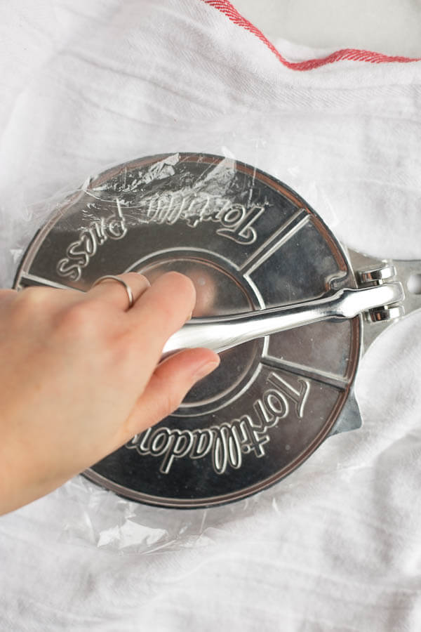 Step 4: Prepare your handy dandy tortilla press. You’ll want to place a piece of saran wrap between the two flat parts. The tortillas will stick to your press if you skip this step. And that would make for a very sad taco.