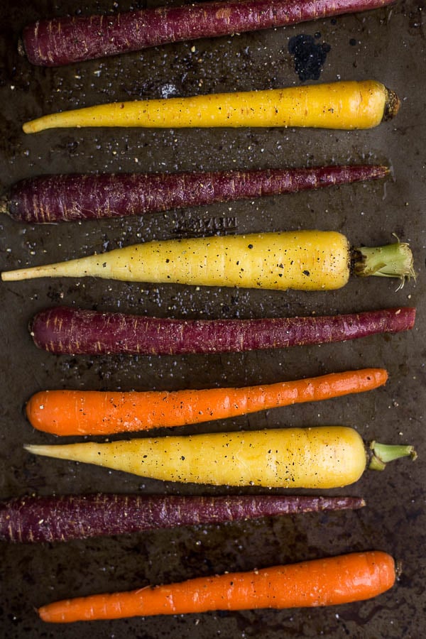 - Add your sliced carrots to a baking sheet cut side-down. Coat with olive oil, salt, and pepper, and roast until fork-tender, about 15-20 minutes.