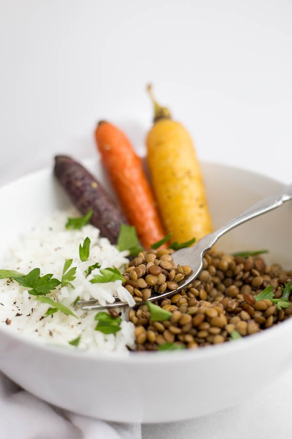 - Once everything is done cooking and the lentils have been drained and cooled slightly, toss your lentils in the sauce to coat. Serve with rice, roasted carrots, and fresh parsley.