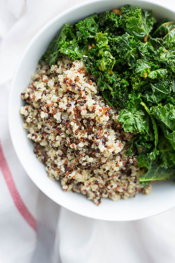 Along with the quinoa and cauliflower, we need some kale. Garlicky kale, to be exact. In all honesty, I believe kale and garlic should be BFFs. They just SO gosh-darn perfect together. I’m seriously obsessed with this combo (see here).