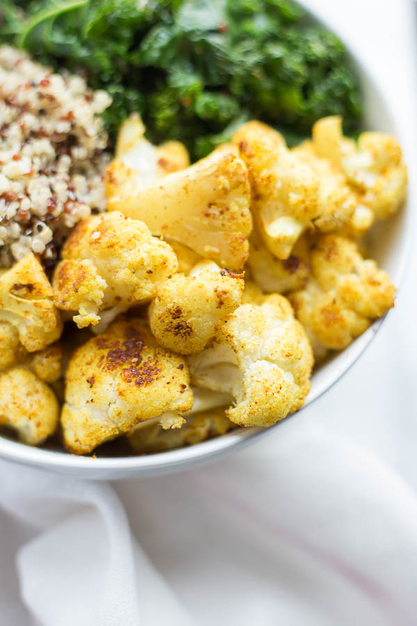 A comforting vegan and gluten free grain salad packed with curried cauliflower, kale, and quinoa!