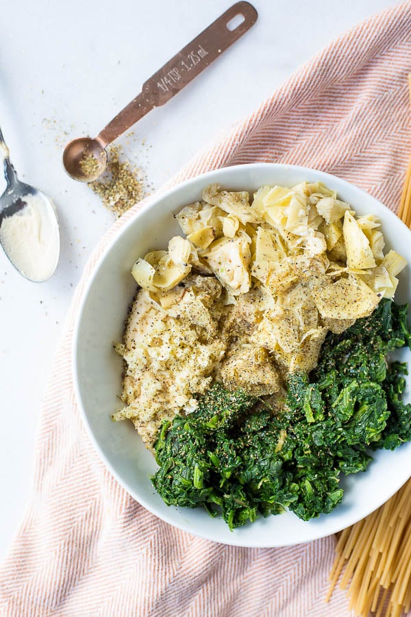 As I mentioned before, Mark looooooooves spinach artichoke dip. But eating spinach artichoke dip for dinner, while totally tasty, isn’t the healthiest thing you could do. We’ve definitely done it, and we’ll probably do it again in the future. But for a quick and easy everyday meal? Let’s choose some healthier ingredients and pair it with some fiber-rich brown rice gluten free pasta, shall we?