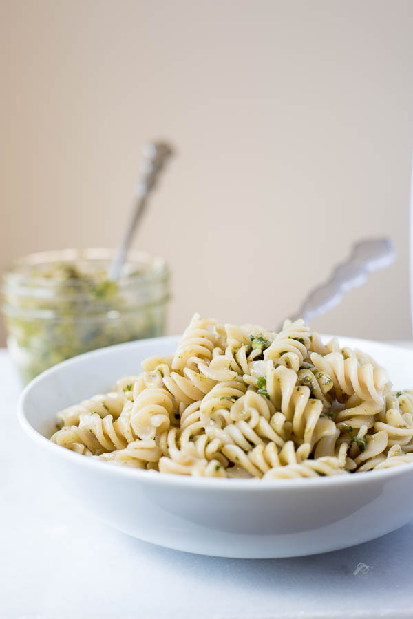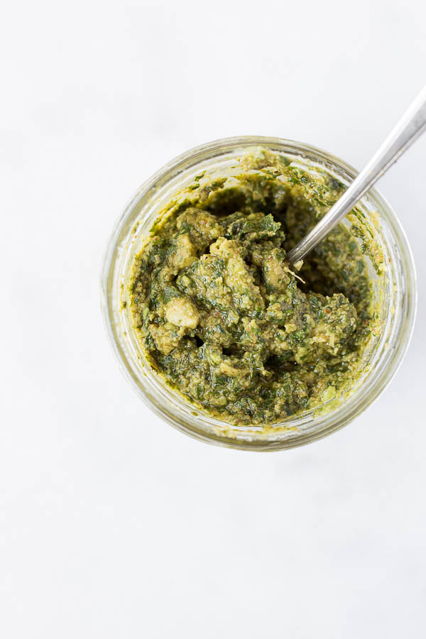AND the almond butter! I don’t buy pine nuts because dannnng girl, they’re expensive; so pesto isn’t a thing that I tend to make very often. Well, not any more! I had a bit of homemade roasted almond butter left, so I threw it in and boy was it a great idea! (she says so humbly) I’m a complete sucker when it comes to nut butters, so I think that it adds the perfect amount of roasty nuttiness to this pesto.