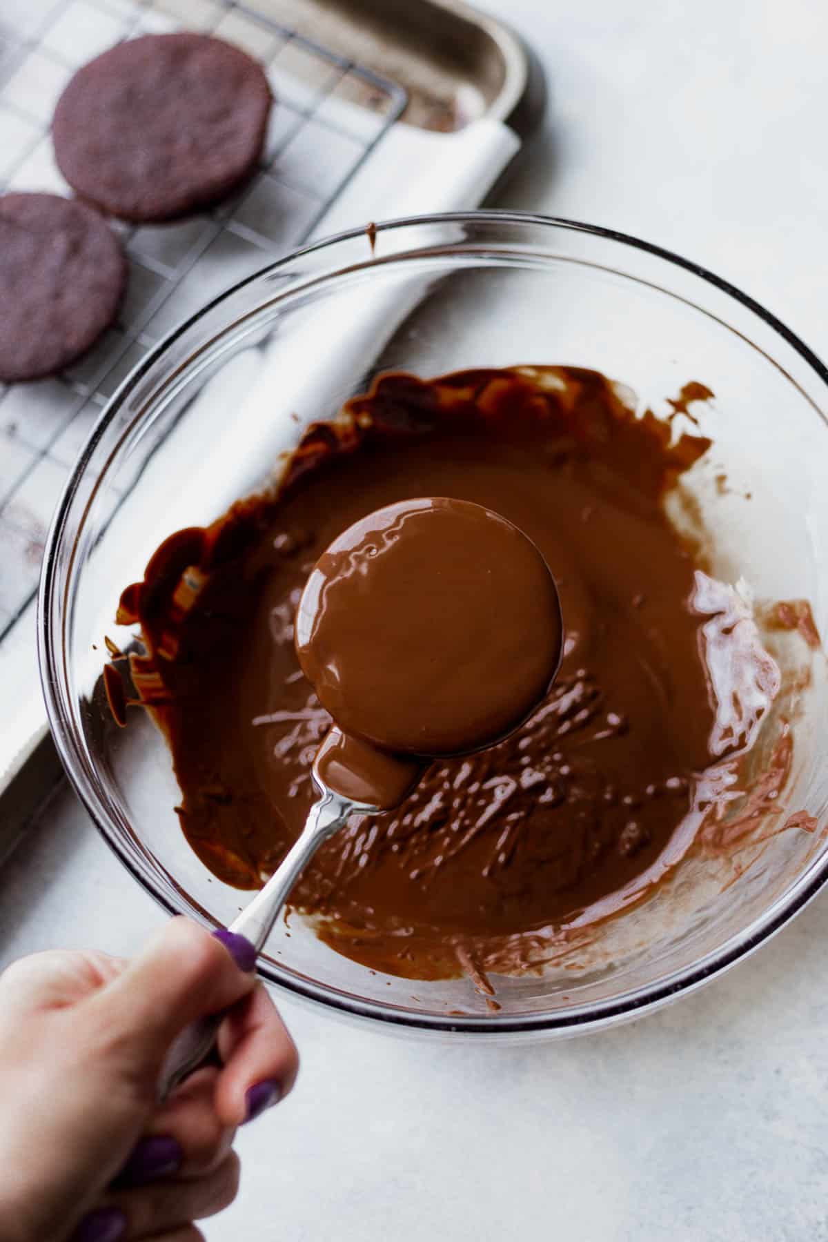- One-by-one, dip your cookies into the chocolate, coating completely. I like to balance the cookie on a fork and beat the fork off the side of the bowl to remove any excess chocolate. Place back on your parchment-lined baking sheet.
