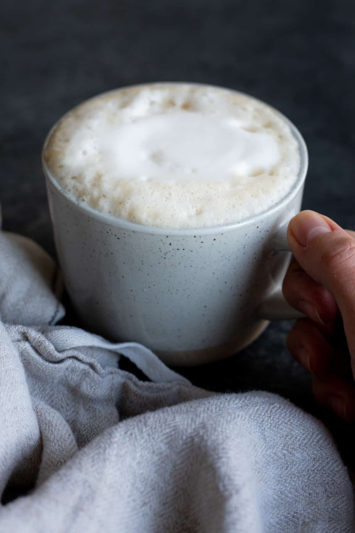 And then you’ll make a latte with some coffee and steamed milk. If you recall from my Oat Milk Peppermint Mocha, I have a milk frother device that I really love, but you can also froth your milk with a whisk or in a jar.