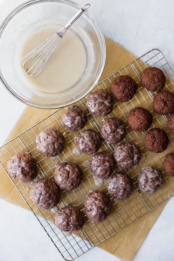 - Whisk the glaze ingredients in a small bowl. Dunk the tops of the cookies in the glaze, swirling so the entire top is covered. Place the cookies back on the cooling rack so that the glaze can drip down. Allow to set up at room temperature or pop them in the fridge for quicker setting.