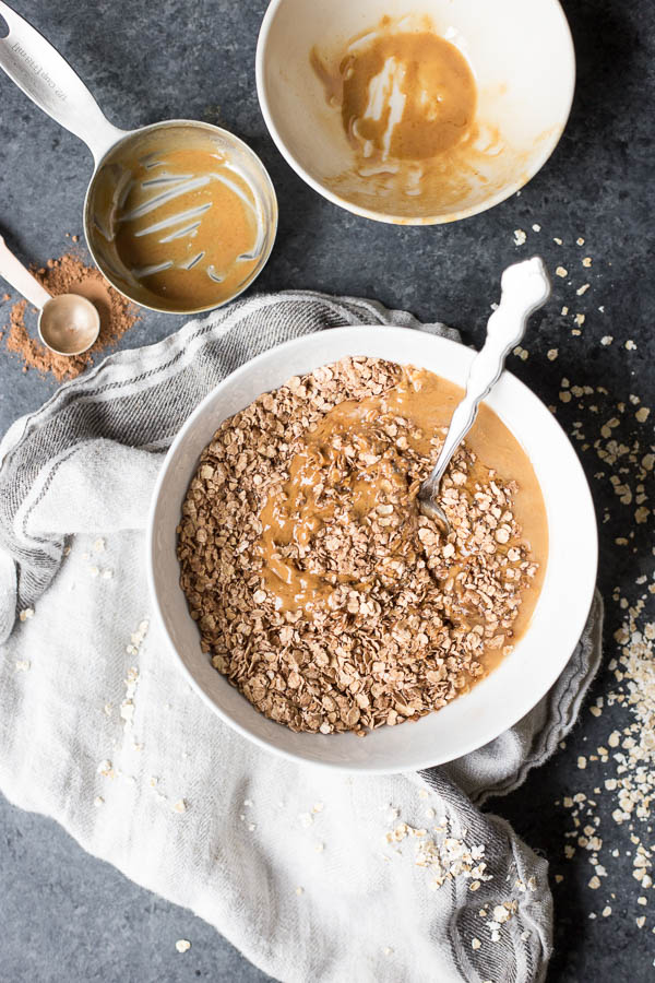 For the dry ingredients: cocoa powder and quick oats. We’ll mix ’em together with the wet ingredients and we’re half way done. Easy peasy, right?
