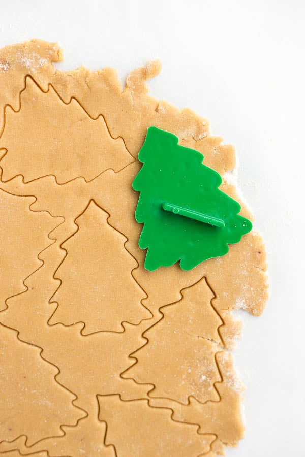 - Cut out your shapes using a cookie cutter. Carefully remove excess dough and place cut cookies on your parchment-lined baking sheet. Roll the excess dough into a ball, roll out, and cut more shapes until no more dough is left.