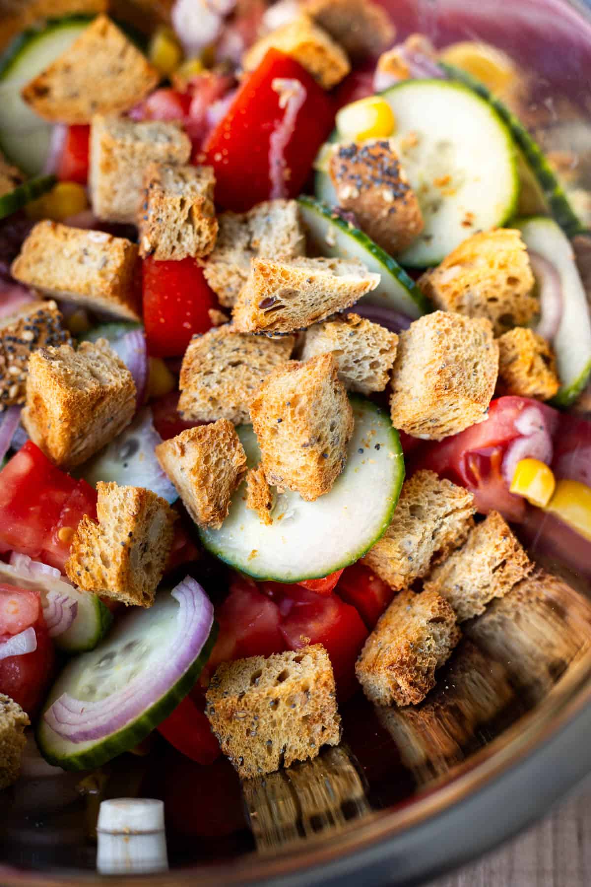 - Combine all of your other salad ingredients (including your stale/toasted bread) in a large bowl.