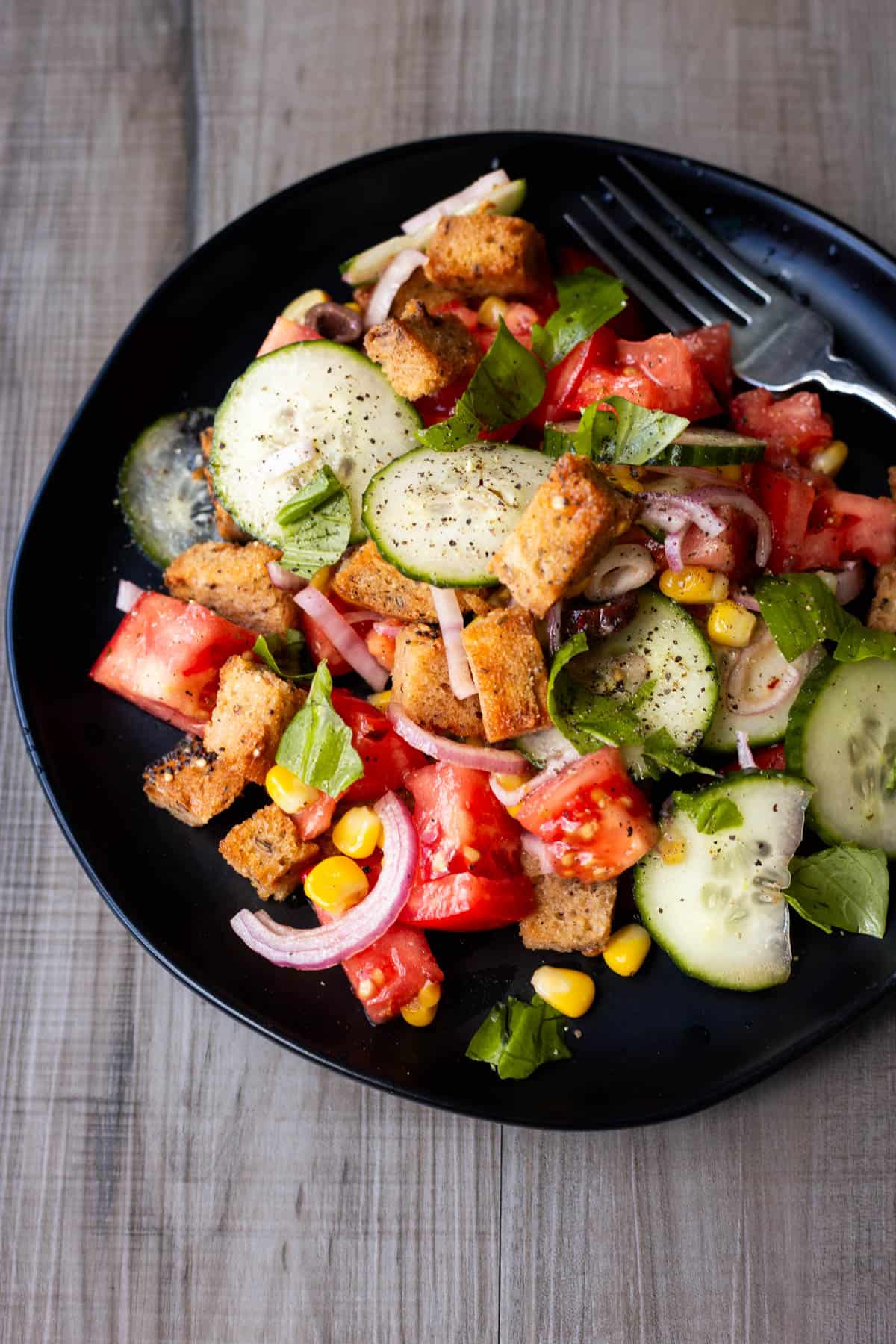 Panzanella is definitely one of those “choose your own adventure” kind of dishes; it can be as simple or complex as you want. But I went relatively simple with mine, allowing the flavors of the season to really shine: