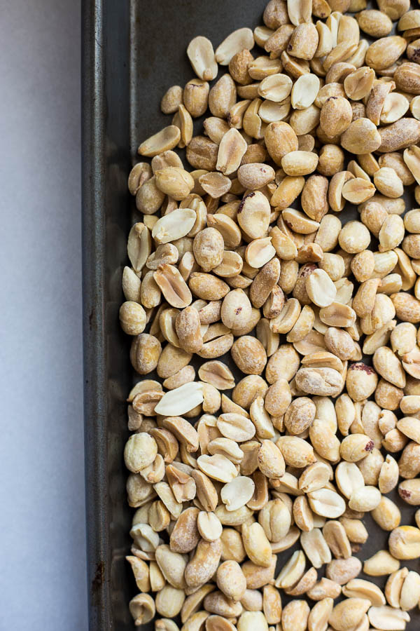 - Preheat your oven to 200 degrees F. Pour peanuts on a baking sheet and bake for 8-10 minutes, or until fragrant.
