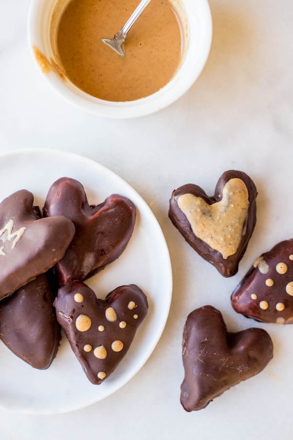 So let’s make these Healthy Peanut Butter Hearts for our sweeties this Valentine’s Day. And you could (and totally should) customize them via the peanut butter coating however you’d like! I tried to be all cutesy and make chocolate peanut butter conversation hearts out of these chocolates, but I’m definitely not an artist so polka-dots and stripes worked, too. Making this M+A heart was a quite a struggle for me, but it’s literally the cutest thing ever so I think it’s perfect. ?