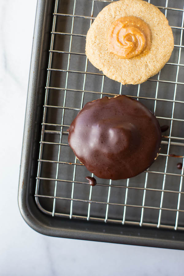 - Assemble your cookies: Remove cookies from the fridge. Dip cookies peanut butter side-down into the Chocolate Coating. Place cookies on a wire cooling rack peanut butter side-up to set. Once all cookies are dipped, return to the fridge to set and store.