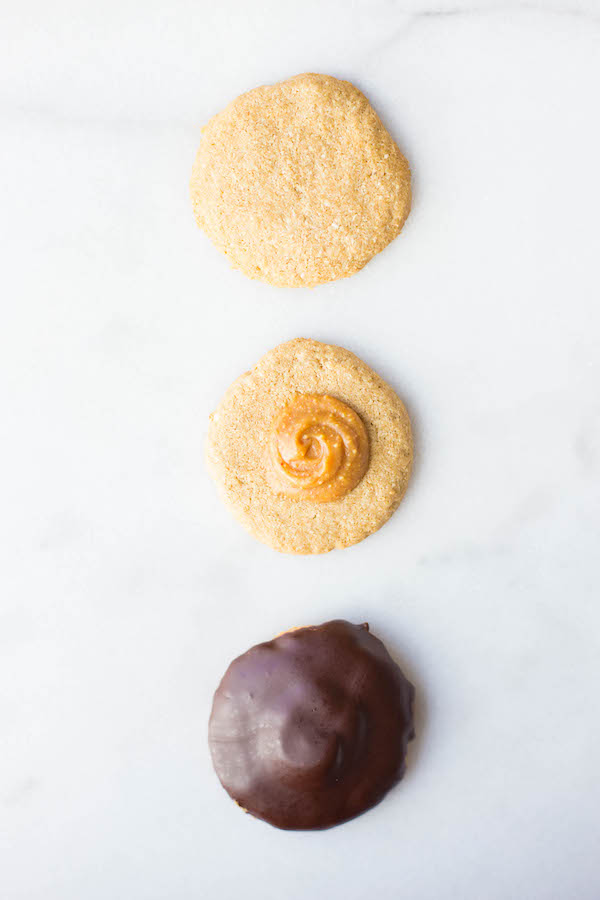 Next up, the peanut butter filling. We’ll use some natural peanut butter, a touch of coconut oil, and a splash of maple syrup to make this recipe really come alive. Obviously, that soft peanut butter center is the most addictive part of the whole Tagalong experience, so I made sure to make it just as addictive as the original. Pinky promise.