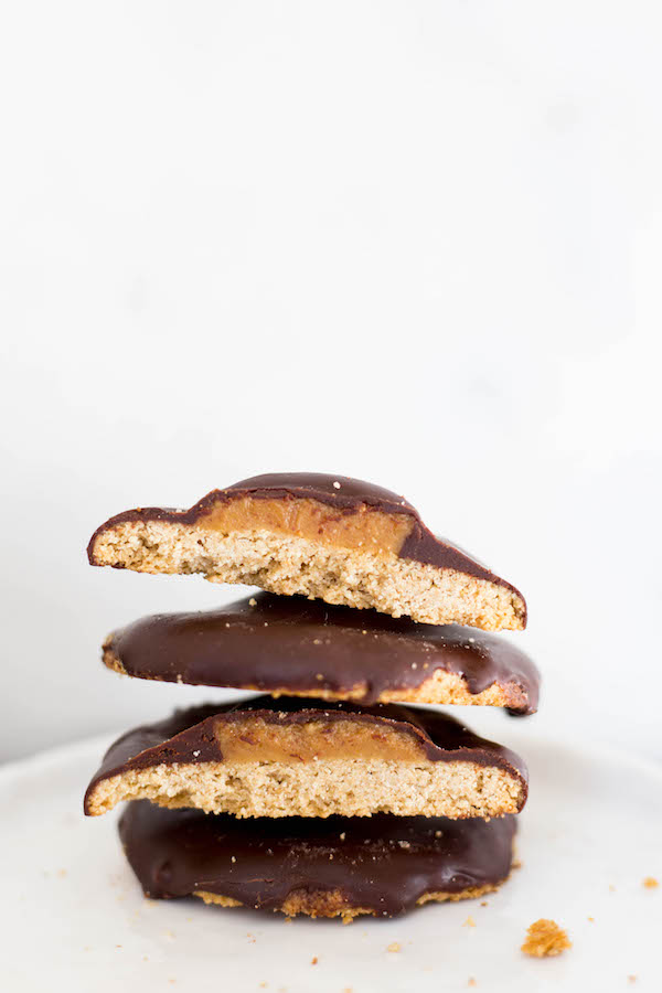 I’m calling it: 4-ingredient cookie + peanut butter filling + homemade chocolate = the Gluten Free Vegan Tagalong recipe of your dreams. If you’re left pining for some Girl Scout cookie goodness after shifting your diet towards a whole foods approach, I have good news for you: your pining is over. And the best part? No waiting around for those Girl Scouts to come knocking on your door; you can have these copycat Tagalongs at any time.