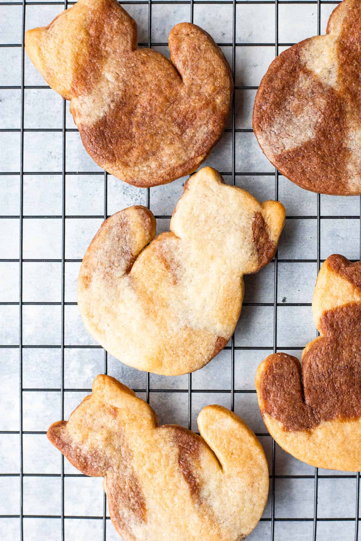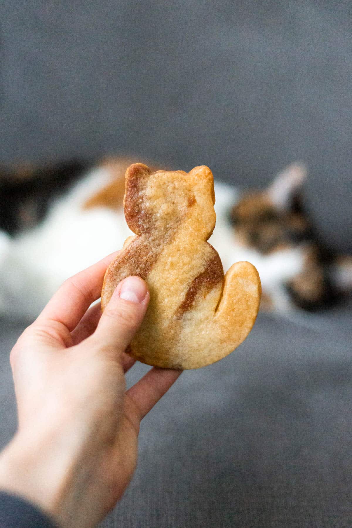 - The next day, cut out your cookies using your favorite cat cookie cutters. You can re-roll the dough to get more cookies out of your batch, but the look will be more tortoise-like than calico! Still v cute.