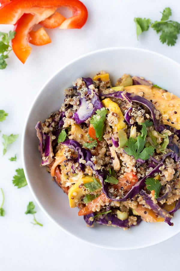 If you’re a fan of peanut sauce, look no further. This recipe is the end-all, be-all of Thai peanut sauce (in my humble opinion ;)). This salad is full of crunch, fresh vegetables, and protein-packed quinoa, so I’d say it may just be a darn-near perfect healthy lunch! (ps. if you like this peanut sauce as much as I do, be sure to try it in these Thai Zucchini Noodle Bowls and Thai Peanut Burrito Bowls!)