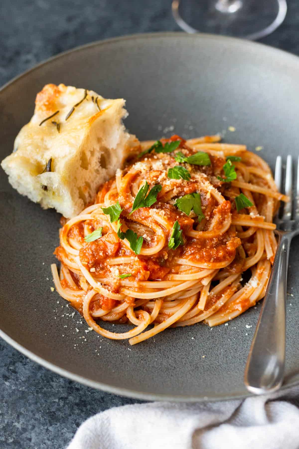 - To serve: 1 pound pasta (cooked), focaccia, vegan parmesan, fresh parsley, and another glass of wine
