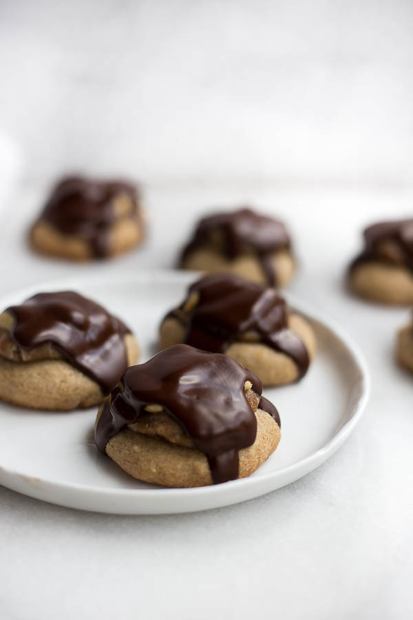 The cookie taste like a maple syrup sugar cookie. Like, hello. It’s the perfect cookie for this time of year, and an even more perfect canvas upon which we can throw delicious toppings. Plus you need only four ingredients to whip them up so yay! One of those ingredients is the Bob’s Red Mill Gluten Free Oat Flour which, I swear, is magical. It’s ground so fine, and it gives baked goods that yummy oatty flavor without making them “oatmeal” cookies. I love using the oat flour in my muffins and cookies!