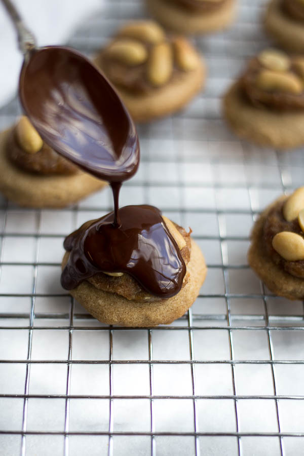 - Measure out about 1 tsp. of your date caramel, and then shape it into a circle and flatten it with your hands. Place it on top of the cookie. Press a few peanut halves into the date caramel so they stick. Pour chocolate on top so it drips down the side. Place in the fridge to set.