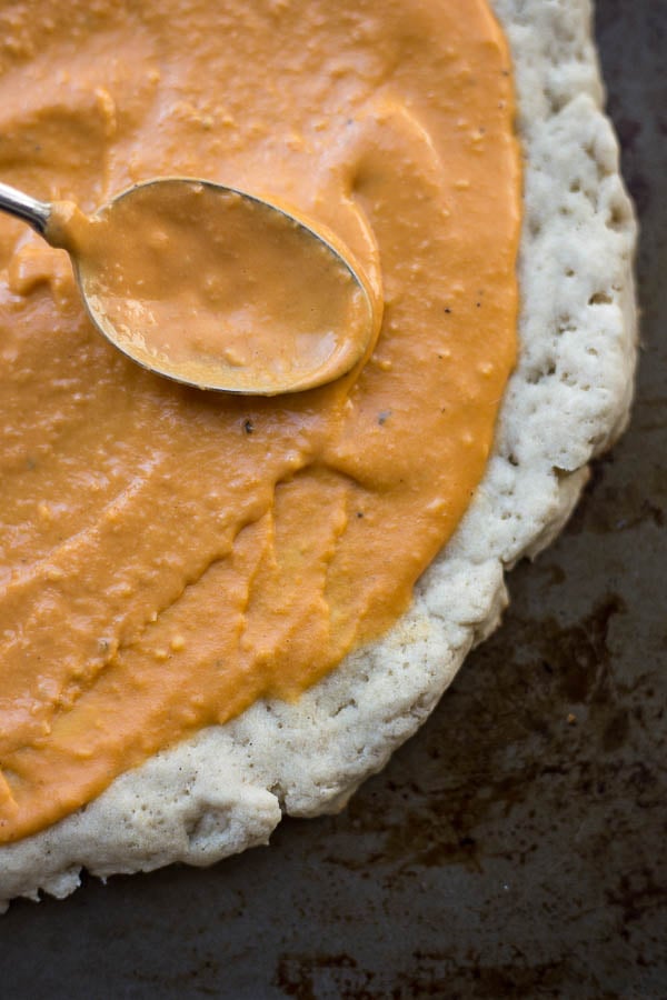 Next, my favorite part: the sauce. To say that I’m obsessed with this sauce would be a morbid understatement. It’s just hummus (obviously) and hot sauce, mixed together until deliciously smooth and perfect. I’ve been using this two-ingredient sauce every single day, usually as a dip for veggies. But then I got this crazy, wonderful idea to throw it on top of a pizza and OMG. I die. It’s SO good. It’s not overly spicy (unless you want to go that route, and in which case I say, “rock on”), but it’s creamy and zesty and spiced and so perfect.