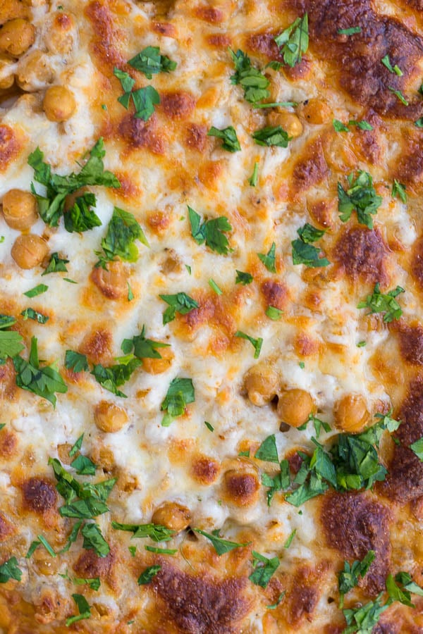 And the toppings: Marinated chickpeas! I tossed some chickpeas with a bit of olive oil, salt, pepper, and cayenne, just so they didn’t feel left out of the awesome flavors happening elsewhere on this pizza. And then I used a bit of mozzarella to get all melty and perfect on the top. If you’re vegan, you can absolutely use a vegan parmesan (like this one) or a vegan mozzarella. They actually sell vegan mozz at Trader Joe’s, and I’ve seen it at my local mega mart; you can absolutely veganize this pizza if desired.