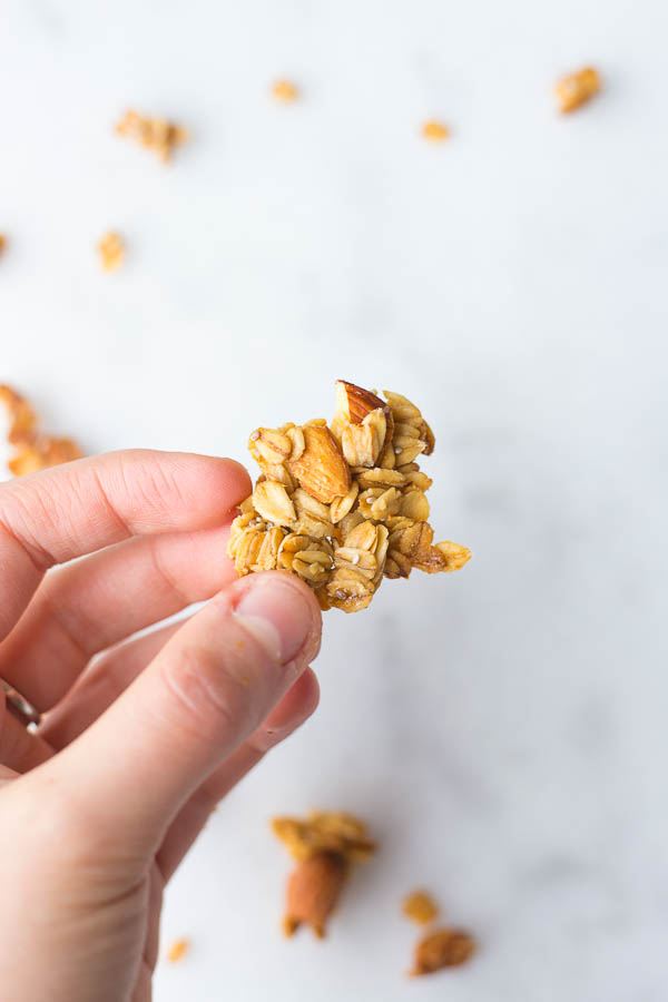 For real though. And I’m not even a huge granola fan. I mean, I totally am – I love the textures, I love the taste, but I can get carried away reeeeal quick. Like, a whole…”one bowl turns into two turns into 10” kind of thing. So I try and stay away from it. But I really can’t with this stuff. Because this granola recipe is probably in my top 5 favorite Fooduzzi recipes of all-time. For real, friends!
